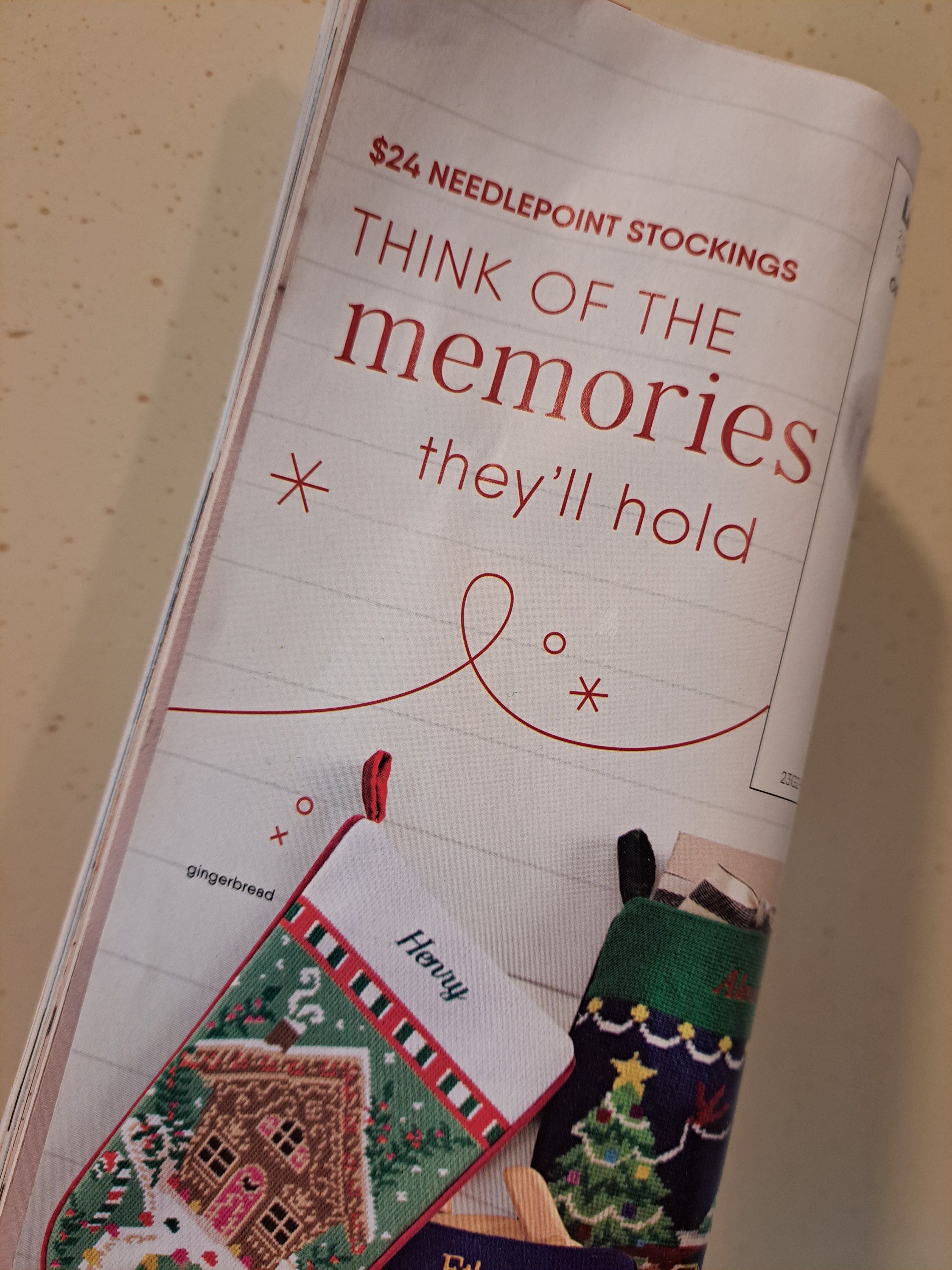 This week, a magazine boasted personalized needlepoint stockings, just like grandma used to make, alongside the words, “Think of the memories they’ll hold.”