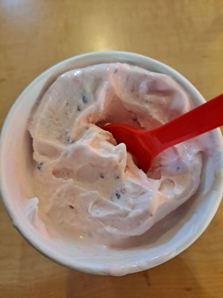 But the girl had seen that I didn’t have ice cream. She had a five dollar bill in her pocket. She snuck away from the table while my attention was diverted and then, just as sneakily, set the cup of pink goodness in front of me.